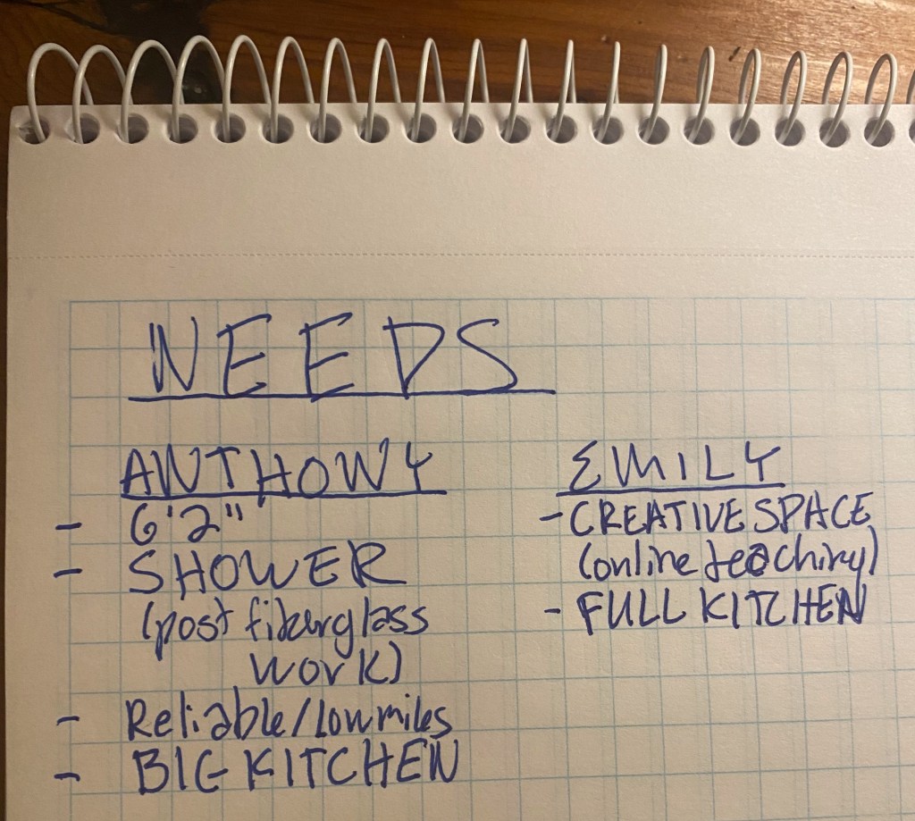 As with any big purchase it’s helpful to lay out just what you are trying to get out of your van. Anthony works a traveling job and can get paid per diem to provide his own shelter.